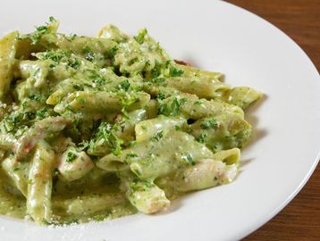 Fresh basil pesto blended with cream, garlic, and parmesan for a vibrant and aromatic sauce that brings bold Italian flavor to any pasta.