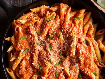 A silky tomato-cream sauce finished with parmesan, garlic, and herbs. This classic Italian favorite combines the richness of cream with the brightness of tomato.